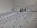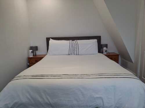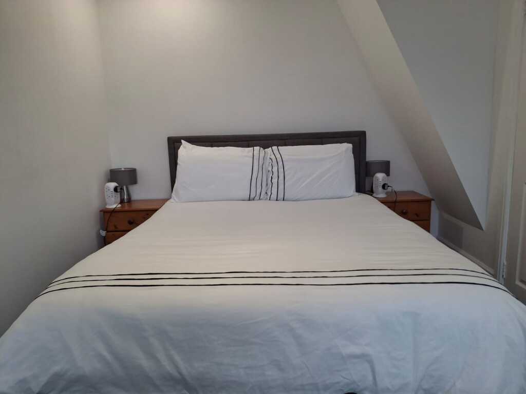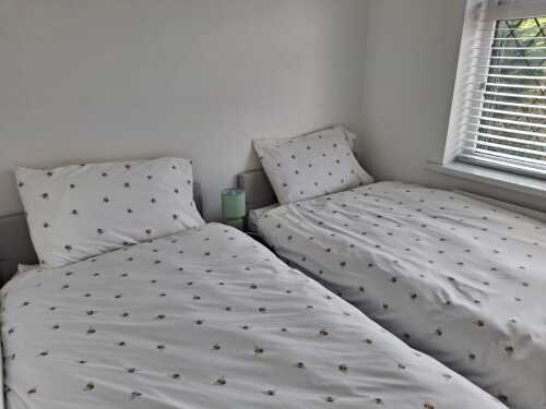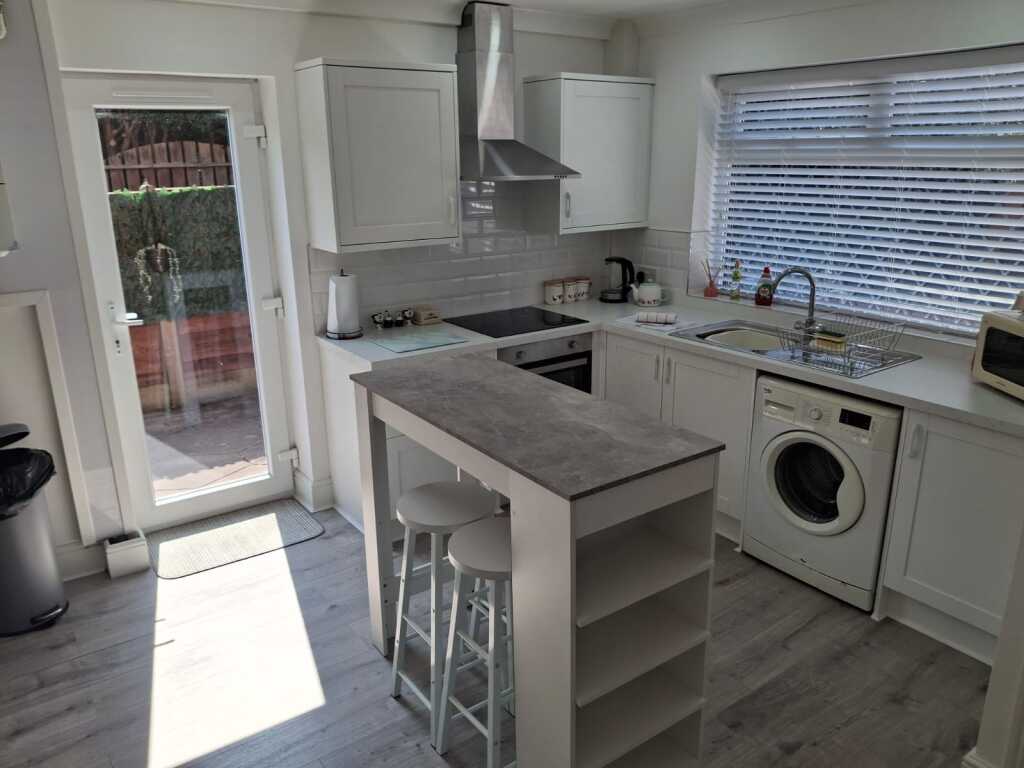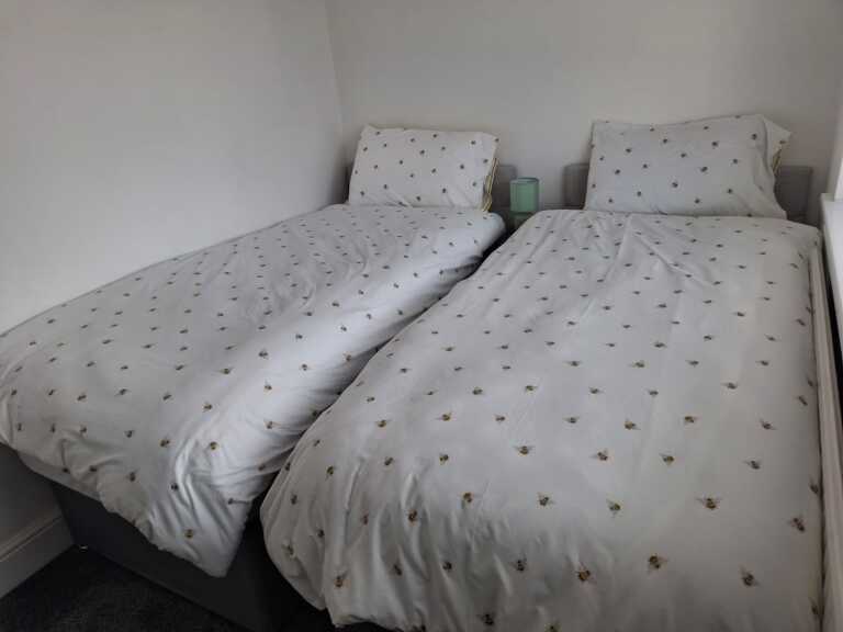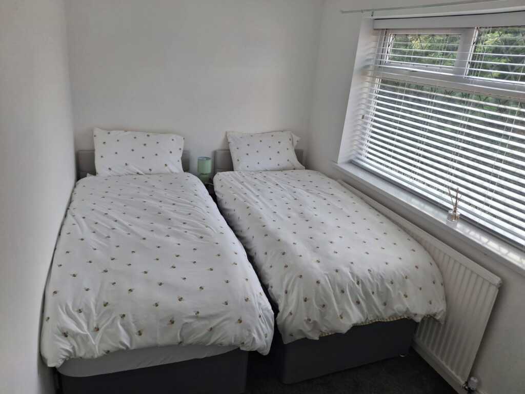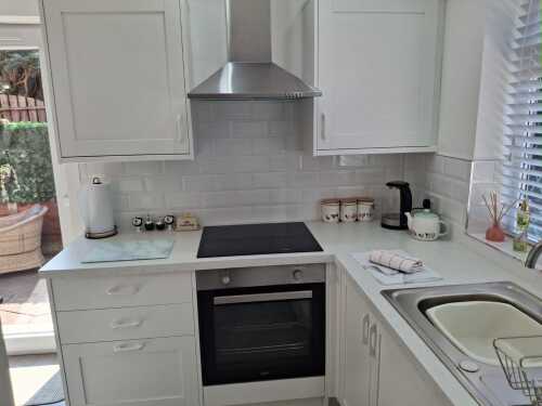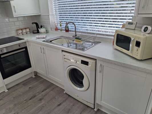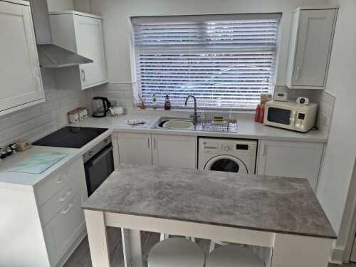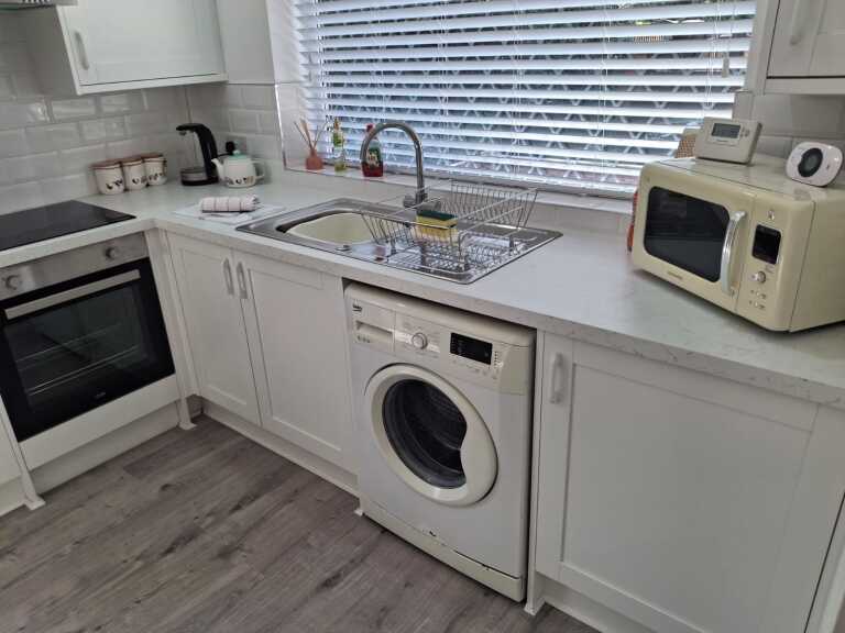 The property features two well-appointed bedrooms: one with a comfortable queen bed, and the other with two single beds – perfect for flexible sleeping arrangements. The modern kitchen is fully equipped with everything you need for a self-catering stay, including a microwave, oven, kettle, and more.