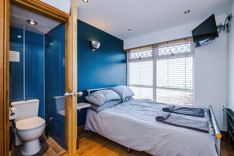 Bed 1 - Double bed, TV with Freeview, shower and sink - built in storage and large wardrobe - full length mirror