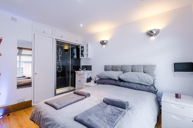 Bed 2 - Double bed, shower and sink - built in storage, chest of drawers, 2 x bed side tables and full length mirror