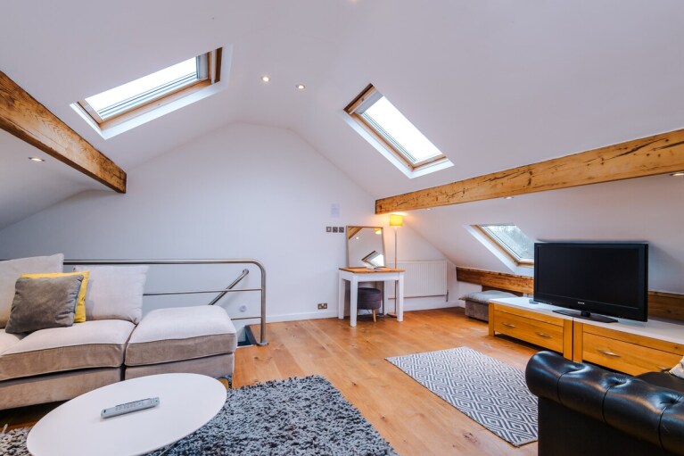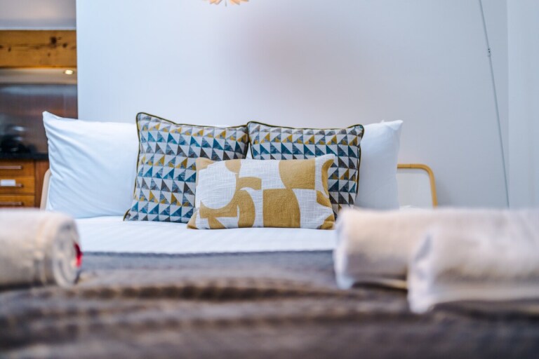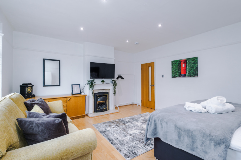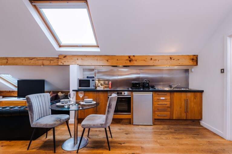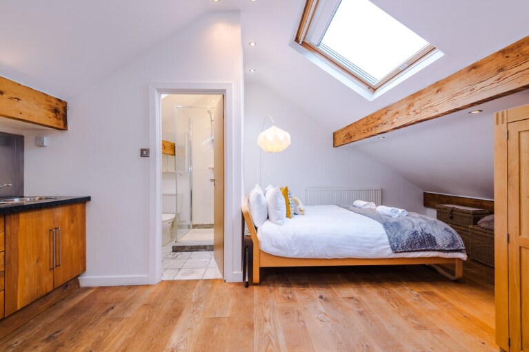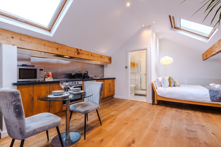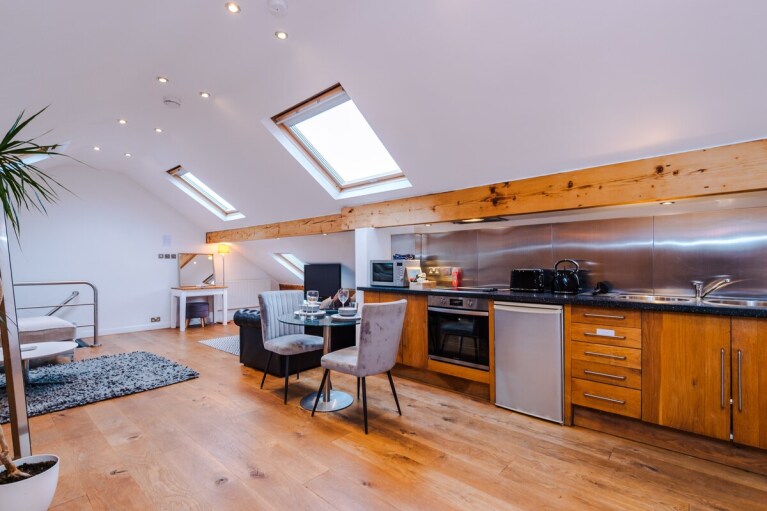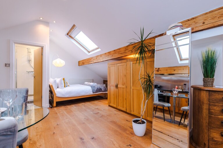 The Loft Apartment is a stylish and contemporary studio, perfect for solo travellers or couples. With a spacious, open-plan design, this apartment features a comfortable double bed, a fully equipped kitchenette, and a modern bathroom. The Loft also boasts large windows that flood the space with natural light, creating a bright and airy atmosphere. Whether you’re relaxing on the sofa, catching up on work with high-speed Wi-Fi, or preparing a meal in the kitchenette, this apartment offers everything you need for a convenient and enjoyable stay.